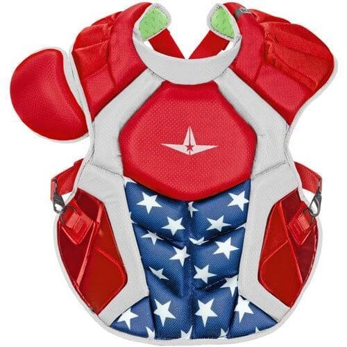 All-Star® chest protectors are measured from the indent at the top of the sternum to the players navel. The chest protector should fit high, with the throat guard over the base of the neck.
